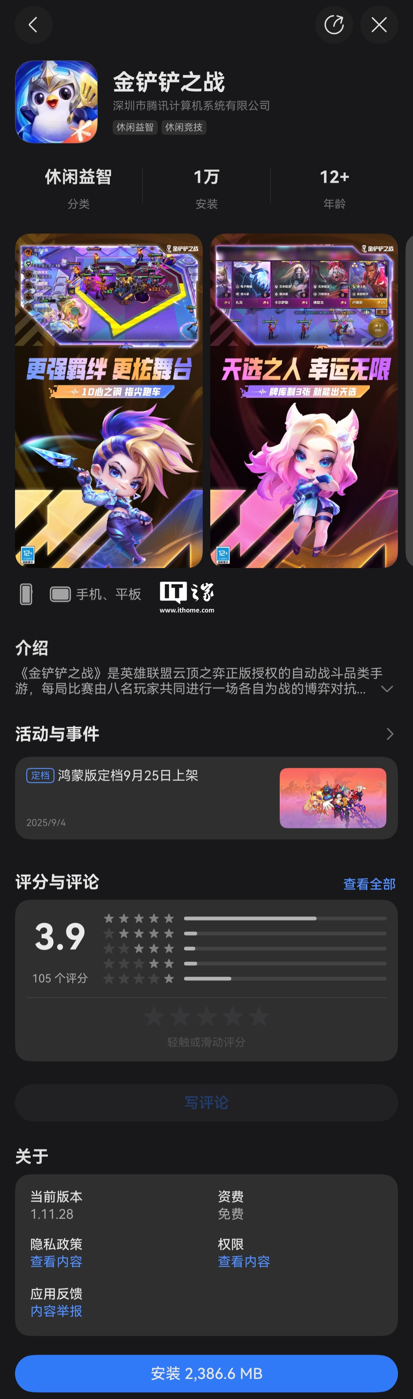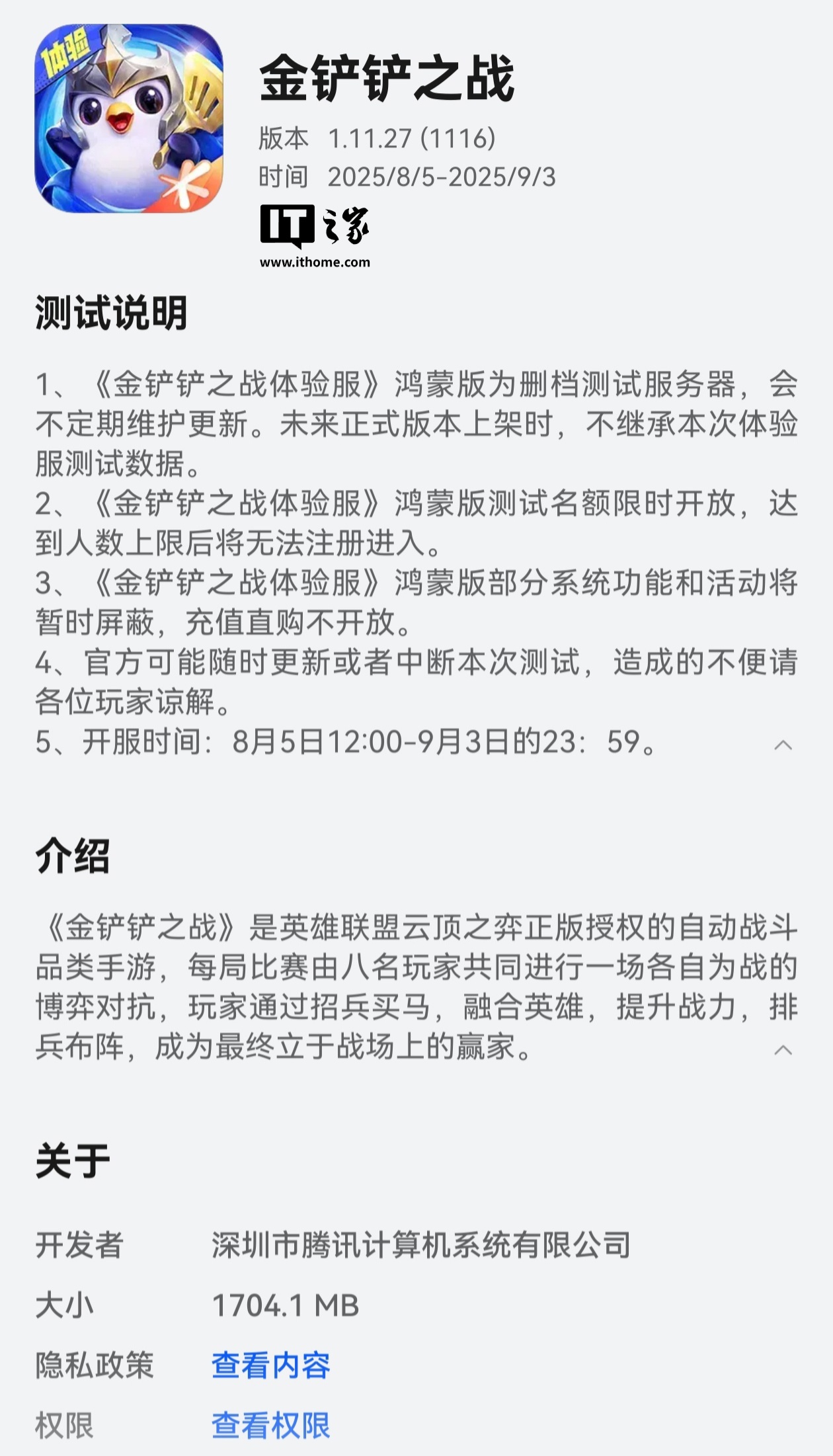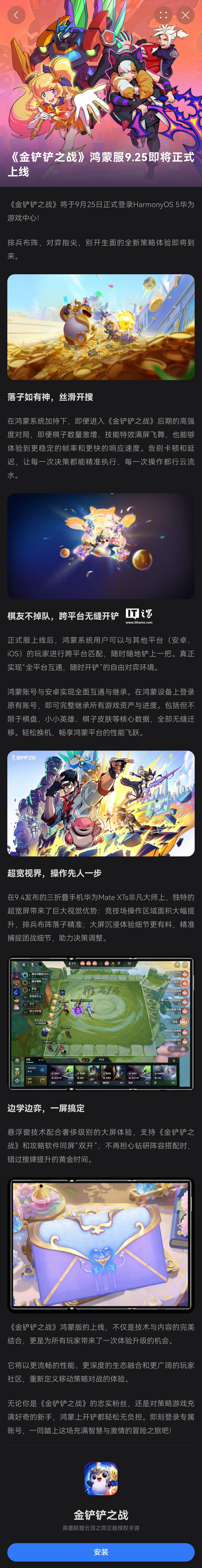 IT之家 9 月 25 日消息,腾讯《金铲铲之战》今日正式登陆华为鸿蒙 HarmonyOS 5 系统,玩家可在游戏中心或华为应用市场(App Gallery)下载游玩。据腾讯官方介绍,《金铲铲之战》深度适配华为 Mate XTs 三折叠手机钱生财,支持大屏无遮挡、边搜边战等特性。