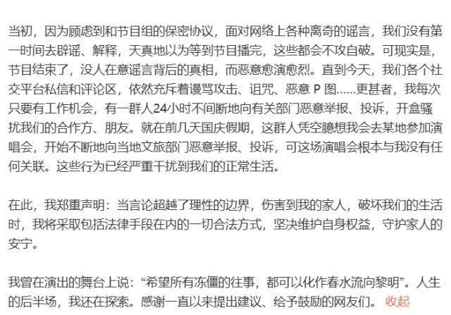 10 月 13 日,《再见爱人 4》的嘉宾、歌手李行亮在微博发布了一篇一千多字的文章,自曝在今年的十一假期有网暴群体捏造了他去某地参加演唱会的行程,并以此向有关部门举报投诉。他坦言,节目播出后,始料未及的网络讨论逐渐演变成人身攻击,这种线上的暴力,随之也转到线下,因为不断被举报,他丢了大部分的工作。