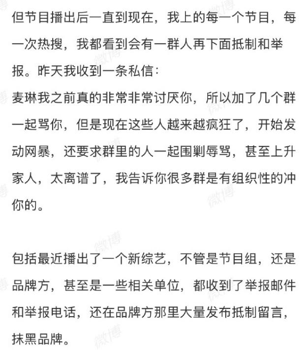 麦琳发文讲述节目播出后自己的遭遇。(图 / 社交媒体截图)