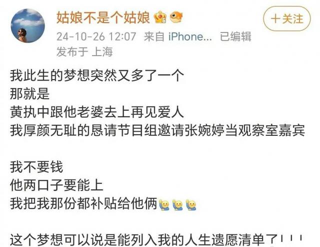 第二季嘉宾张婉婷在微博喊话让黄执中也去参加情感综艺。(图 / 微博 @姑娘不是个姑娘)
